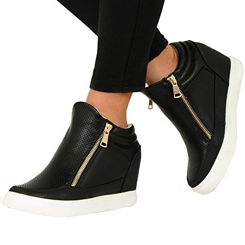 Best Seller! Brand New Cucu Fashion Womens Low Wedges Ladies Side Zip Ankle Trainers Sneakers Black Pu Shoes Size Uk 6 Review